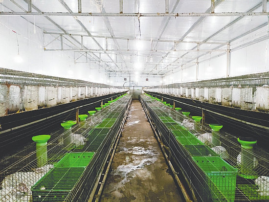綠樹掩映中,棟棟兔舍依山而建。兔舍內(nèi),一排排兔籠整齊排列,一只只毛茸茸的白兔圓潤肥壯。