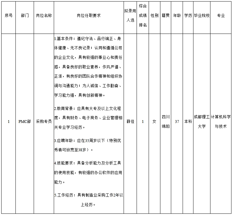 根據(jù)四川九華光子通信技術有限公司發(fā)布的招聘公告及招聘相關規(guī)定,經面試、考察、體檢等程序,擬錄用薛佳同志到四川九華光子通信技術有限公司工作,現(xiàn)予以公示,具體情況如下: