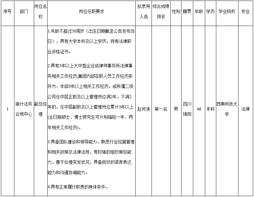 根據(jù)綿陽市投資控股(集團)有限公司關(guān)于審計法務(wù)合規(guī)中心副職市場化選聘的公告及招聘相關(guān)規(guī)定,經(jīng)筆試、面試、考察、體檢等程序,擬錄用趙何濤同志為集團審計法務(wù)合規(guī)中心副總經(jīng)理,現(xiàn)予以公示,具體情況如下:
