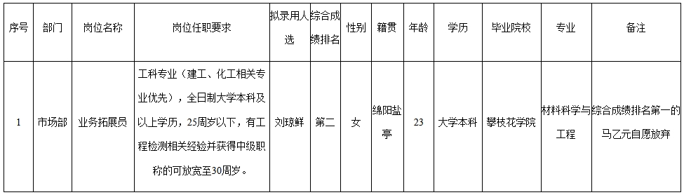 根據(jù)綿陽市建設(shè)工程質(zhì)量檢測中心有限責(zé)任公司發(fā)布的招聘公告及招聘相關(guān)規(guī)定,經(jīng)筆試、面試、背景調(diào)查、體檢等程序,擬錄用劉瓊鮮同志到綿陽市建設(shè)工程質(zhì)量檢測中心有限責(zé)任公司工作,現(xiàn)予以公示,具體情況如下: