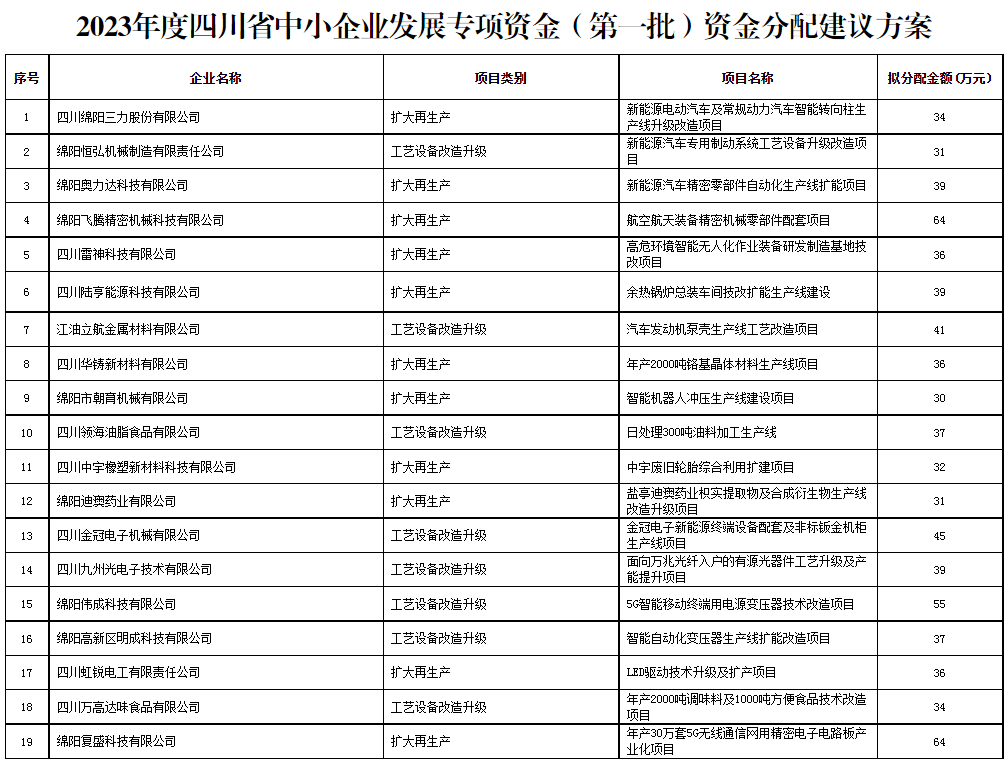 根據(jù)市經(jīng)信局《關(guān)于做好2023年度四川省中小企業(yè)發(fā)展專項(xiàng)資金(第一批)申報(bào)工作的通知》(綿經(jīng)信企業(yè)〔2023〕578號(hào))要求,通過(guò)企業(yè)自主申報(bào),縣(市、區(qū))、園區(qū)工業(yè)經(jīng)濟(jì)主管部門初審?fù)扑],經(jīng)相關(guān)科室審核、專家評(píng)審、現(xiàn)場(chǎng)核查和市經(jīng)信局黨組會(huì)審議等程序?,F(xiàn)對(duì)擬支持的19家企業(yè)(項(xiàng)目)名單予以公示。
