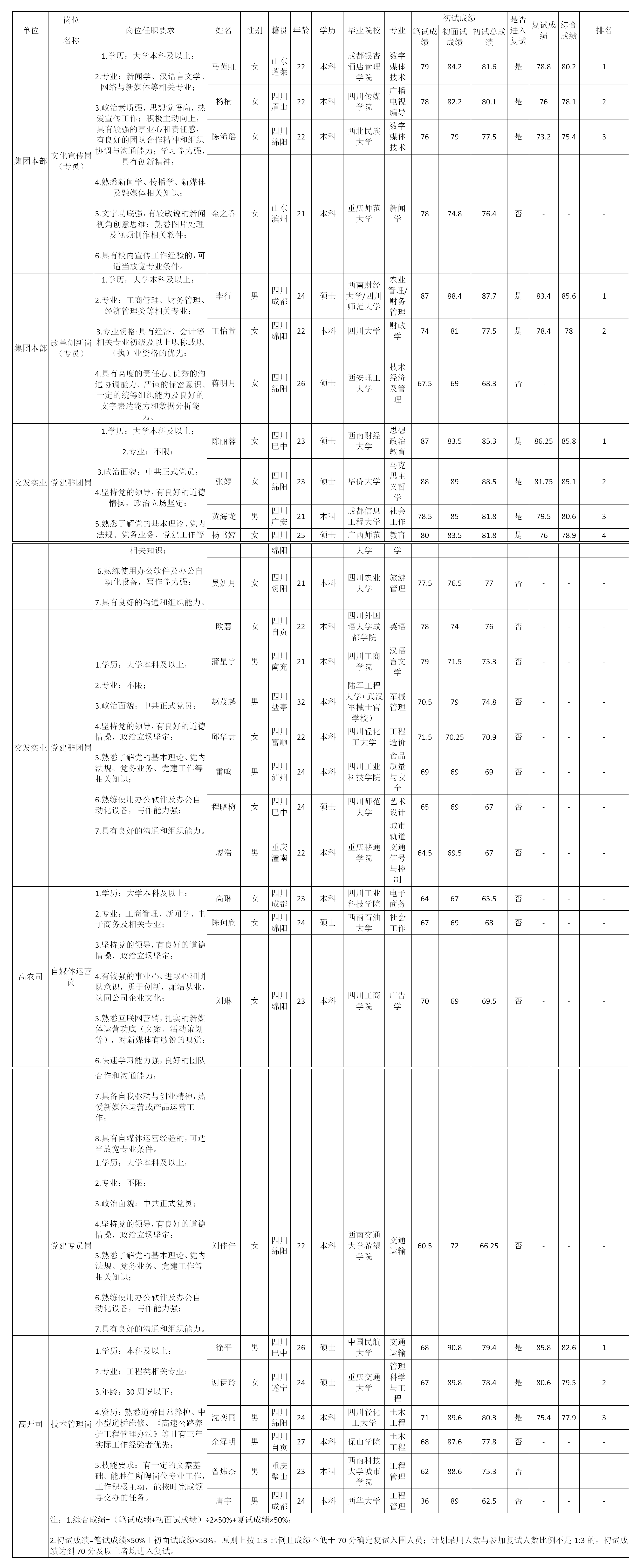 根據(jù)交發(fā)集團(tuán)發(fā)布的招聘公告及招聘相關(guān)規(guī)定,經(jīng)資格審查、筆試、面試等程序,現(xiàn)將成績予以公示。