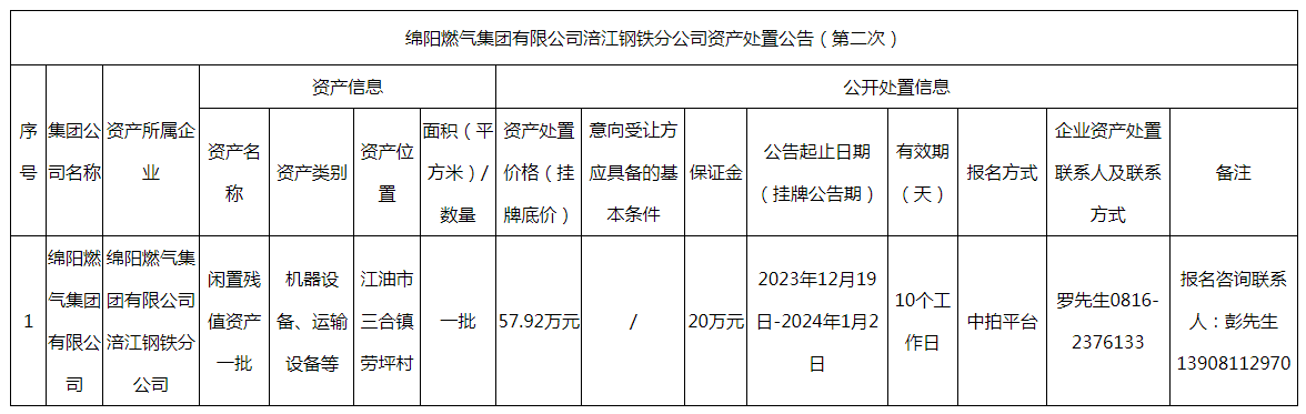 綿陽(yáng)燃?xì)饧瘓F(tuán)有限公司涪江鋼鐵分公司資產(chǎn)處置公告(第二次)