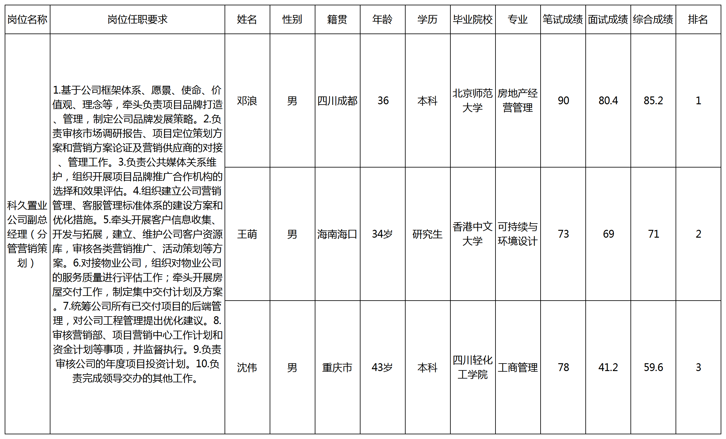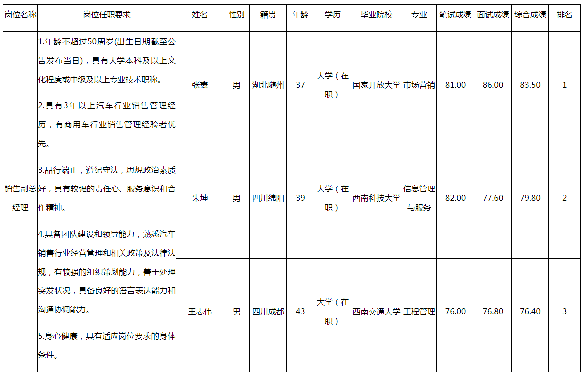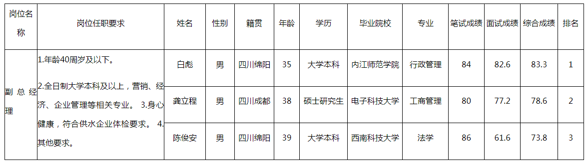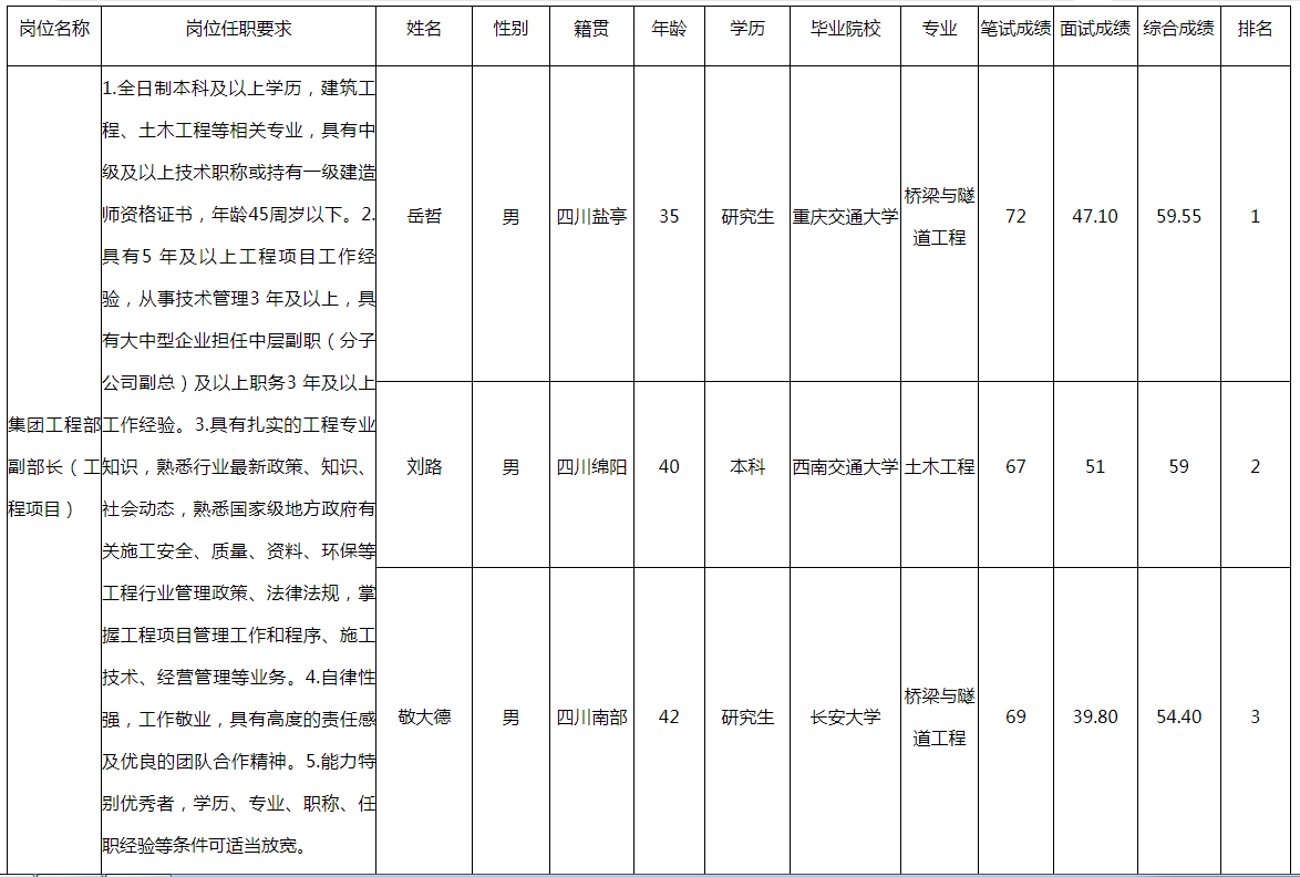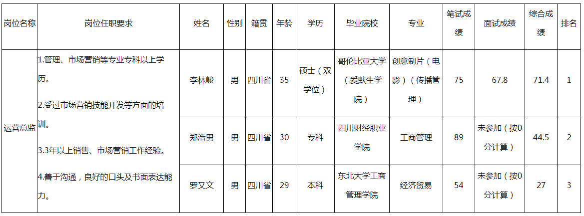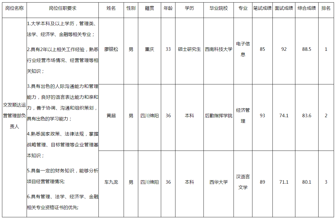 根據(jù)綿陽市國資委發(fā)布的面向全國選聘20名國企經(jīng)營管理人員的公告及相關(guān)規(guī)定,對(duì)11個(gè)達(dá)到開考比例的崗位應(yīng)聘人員組織能力測試、面試(另有9個(gè)崗位未達(dá)到開考比例終止競聘),現(xiàn)將各應(yīng)聘人員成績予以公示。