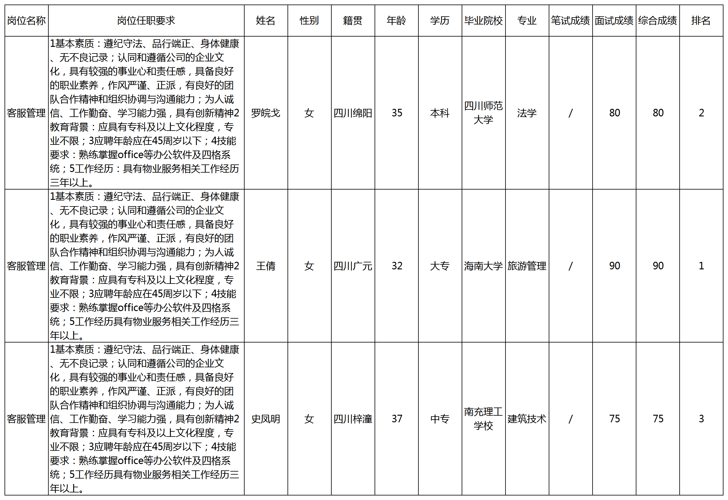 根據(jù)長虹物業(yè)服務有限責任公司綿陽分公司發(fā)布的招聘公告及招聘相關規(guī)定,經(jīng)筆試、面試等程序,現(xiàn)將筆試(面試)成績予以公示。