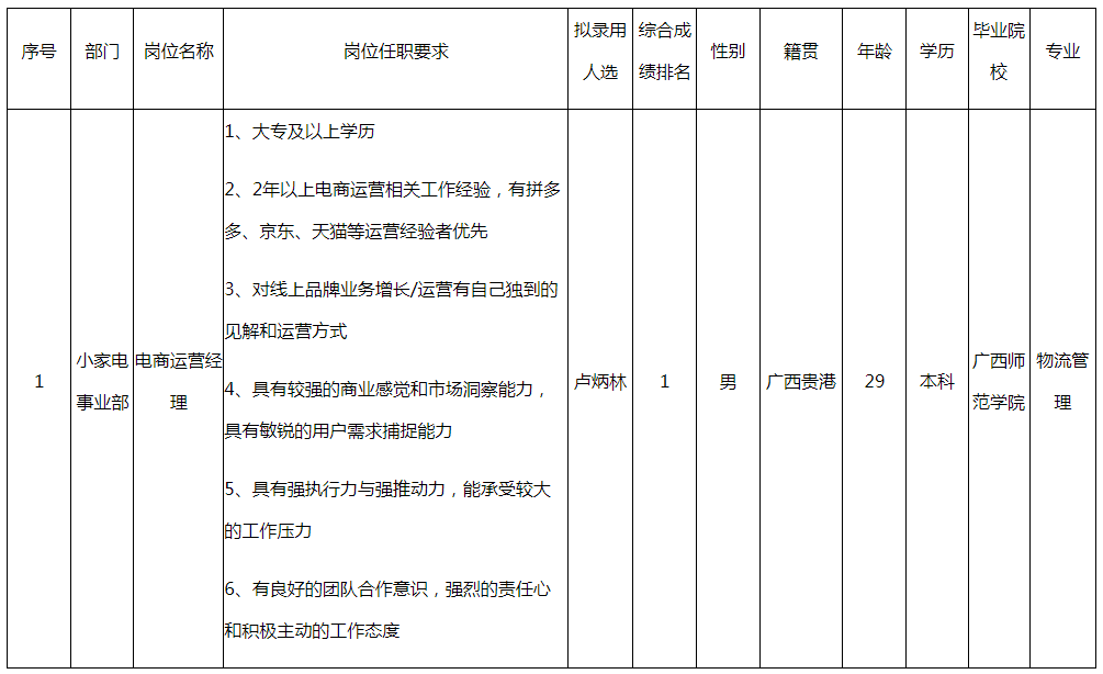 根據(jù)公司經營管理需要,小家電事業(yè)部招聘電商運營崗位1人,經簡歷篩選、面試、體檢等程序,盧炳林滿足錄用條件,現(xiàn)予以公示。