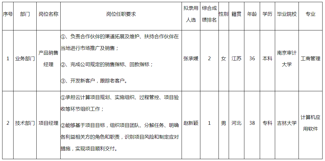 根據(jù)四川長虹佳華信息產(chǎn)品有限責(zé)任公司發(fā)布的招聘公告及招聘相關(guān)規(guī)定,經(jīng)筆試、面試、考察、體檢等程序,擬錄用張承媛、趙新穎同志到四川長虹佳華信息產(chǎn)品有限責(zé)任公司工作,現(xiàn)予以公示,具體情況如下: