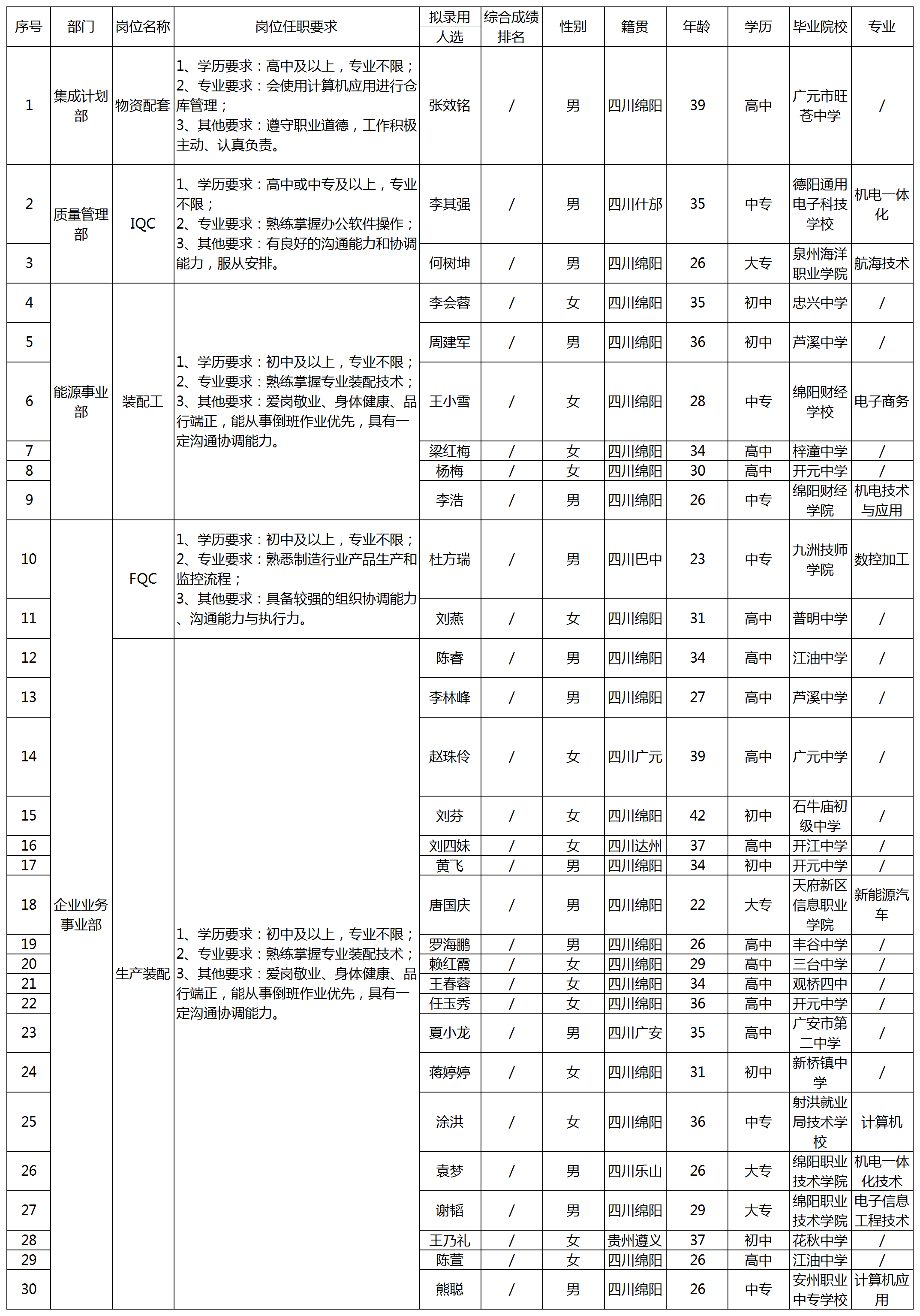 根據(jù)四川九州電子科技股份有限公司發(fā)布的招聘公告及招聘相關(guān)規(guī)定,經(jīng)筆試、面試、考察、體檢等程序,擬錄用張效銘等30名同志到四川九州電子科技股份有限公司工作,現(xiàn)予以公示,具體情況如下:
