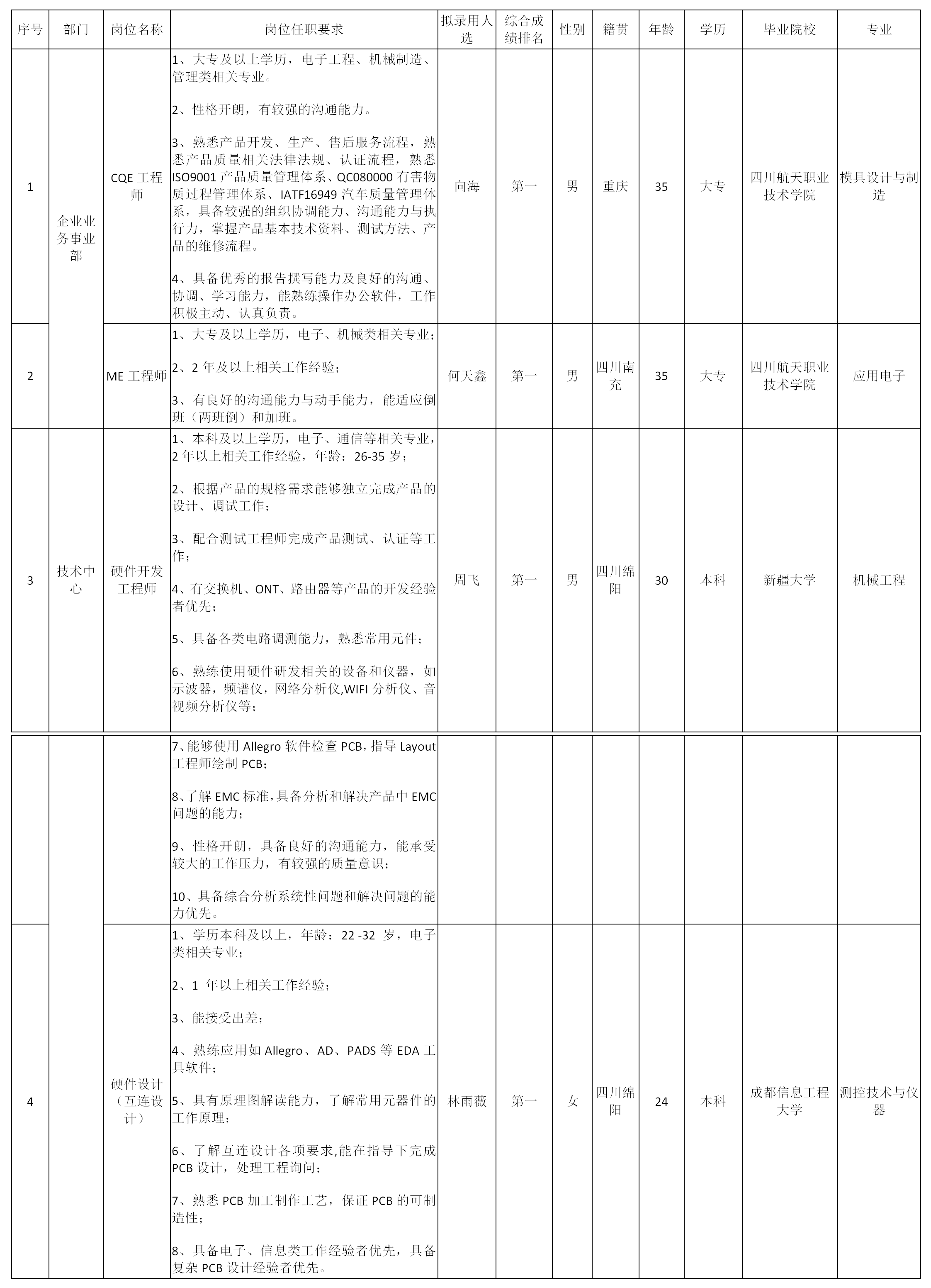 根據(jù)四川九州電子科技股份有限公司發(fā)布的招聘公告及招聘相關(guān)規(guī)定,經(jīng)筆試、面試、考察、體檢等程序,擬錄用向海等4名同志到四川九州電子科技股份有限公司工作,現(xiàn)予以公示,具體情況如下: