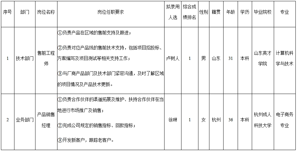 根據(jù)四川長虹佳華信息產(chǎn)品有限責任公司發(fā)布的招聘公告及招聘相關(guān)規(guī)定,經(jīng)筆試、面試、考察、體檢等程序,擬錄用盧樹人、徐琳同志到四川長虹佳華信息產(chǎn)品有限責任公司工作,現(xiàn)予以公示,具體情況如下: