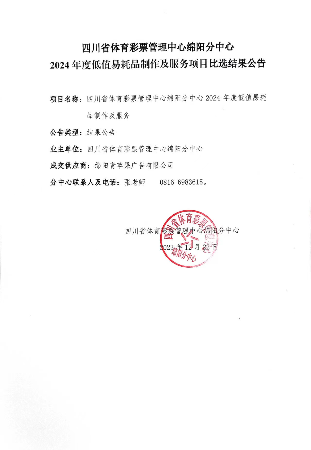 四川省體育彩票管理中心綿陽分中心2024年度低值易耗品制作及服務項目比選結果公告