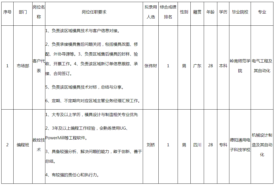 根據(jù)長(zhǎng)虹模塑公司發(fā)布的招聘公告及招聘相關(guān)規(guī)定,經(jīng)筆試、面試、考察、體檢等程序,擬錄用張偉財(cái)同志到客戶代表崗工作,劉橋同志到數(shù)控技術(shù)崗位工作,現(xiàn)予以公示,具體情況如下: