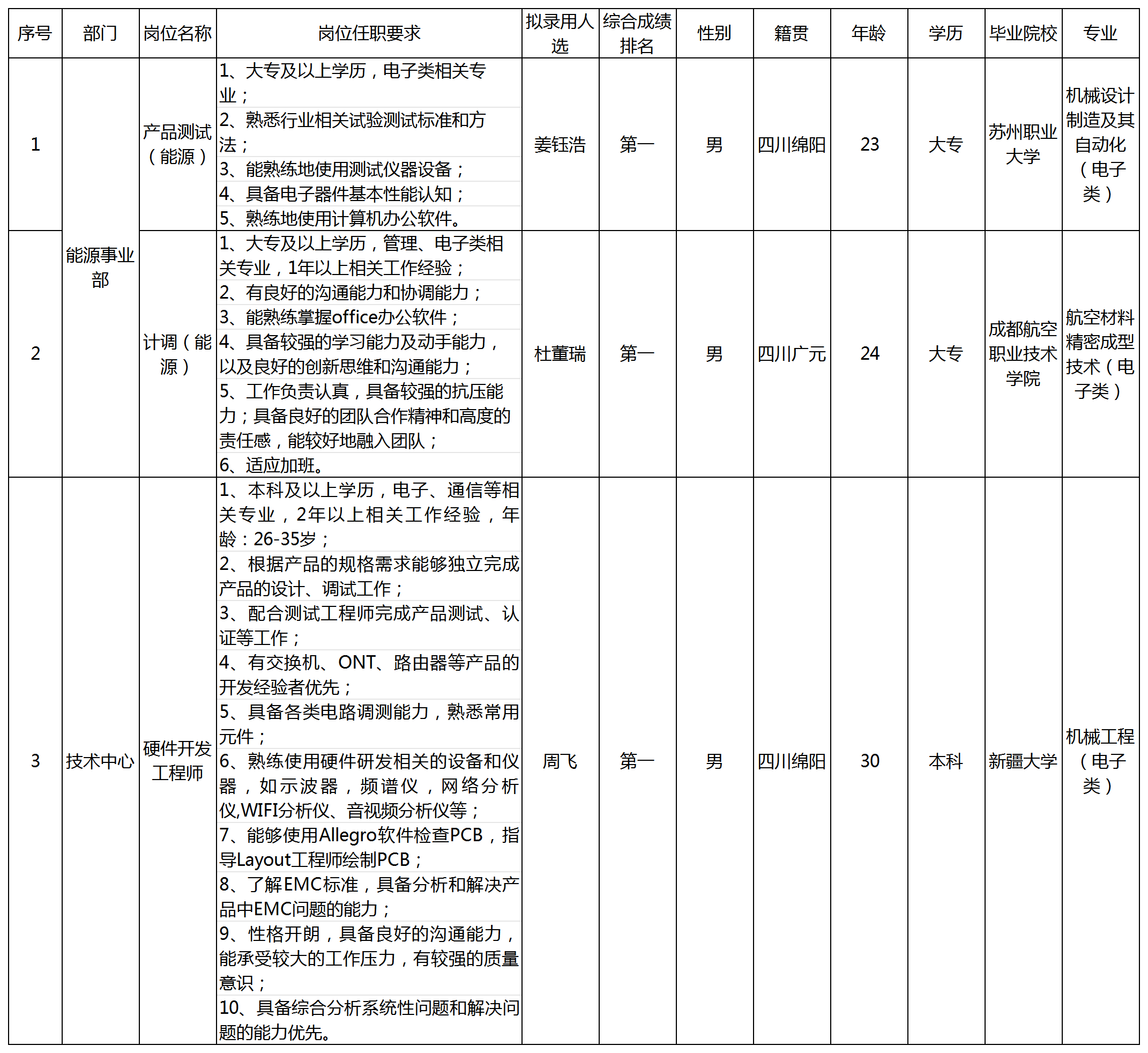 根據(jù)四川九州電子科技股份有限公司發(fā)布的招聘公告及招聘相關(guān)規(guī)定,經(jīng)筆試、面試、考察、體檢等程序,擬錄用姜鈺浩等3名同志到四川九州電子科技股份有限公司工作,現(xiàn)予以公示,具體情況如下: