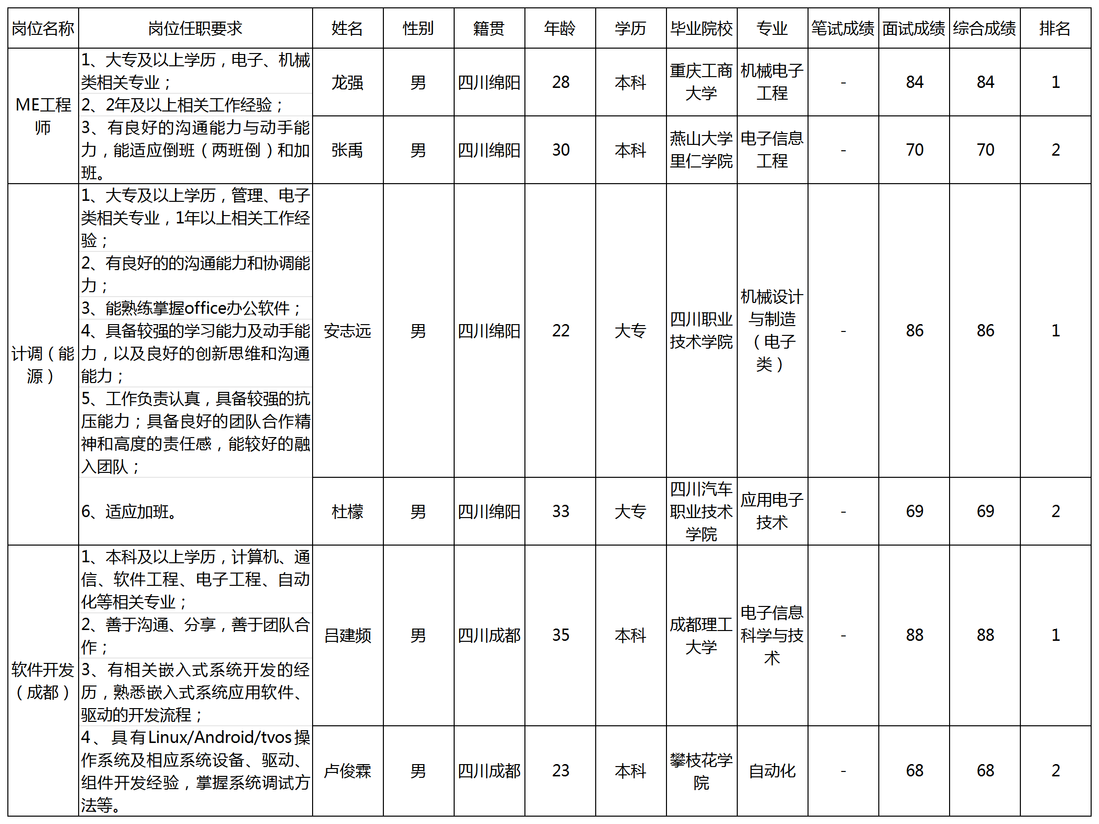 根據(jù)四川九州電子科技股份有限公司發(fā)布的招聘公告及招聘相關(guān)規(guī)定,經(jīng)筆試、面試等程序,現(xiàn)將筆試(面試)成績予以公示。