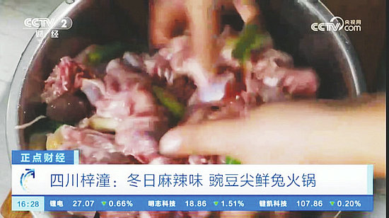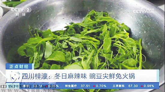 12月15日,央視CCTV2《正點(diǎn)財(cái)經(jīng)》將鏡頭再次對(duì)準(zhǔn)綿陽(yáng)梓潼冬日麻辣鮮香美食—豌豆尖鮮兔火鍋。報(bào)道稱,每到冬天的時(shí)候,梓潼縣的村民就喜歡將兔肉與當(dāng)季豌豆尖組合,做上一鍋麻辣鮮香的豌豆尖鮮兔火鍋,驅(qū)寒暖身。