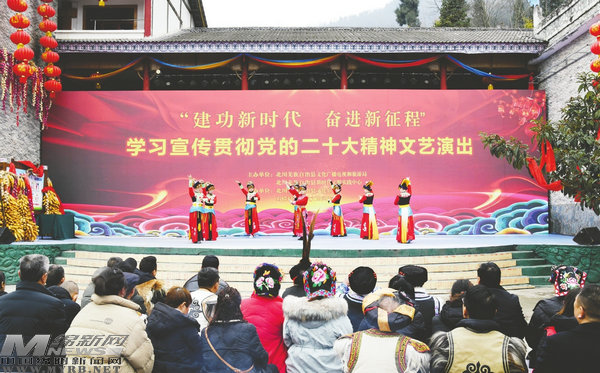 “鄉(xiāng)親們,仔細聽,黨的二十大精神記在心;新時代、新征程,與黨同心啟航程;新觀點、新論斷,中國變化世界贊;新思想、新戰(zhàn)略,新的要求聽我說……”北川青片鄉(xiāng)西窩羌寨58歲的非遺傳承人梁元斌,自編自演羌族“打岔”非遺節(jié)目《禮贊黨的二十大》,用耳熟能詳?shù)姆绞?,將黨的二十大精神傳遞給家家戶戶。