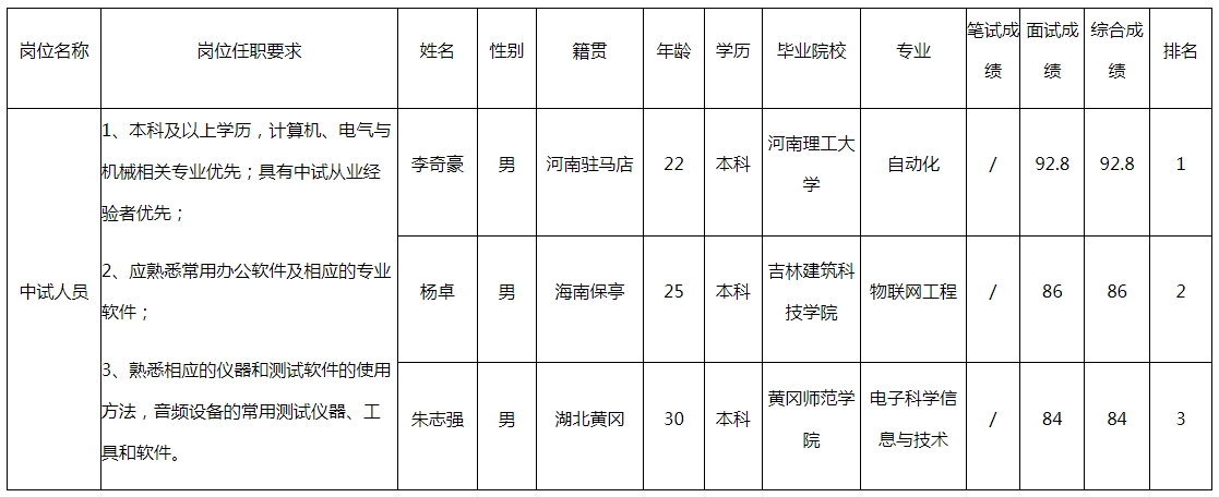 根據(jù)四川湖山電器股份有限公司發(fā)布的招聘公告及招聘相關(guān)規(guī)定,經(jīng)筆試、面試等程序,現(xiàn)將筆試(面試)成績予以公示。