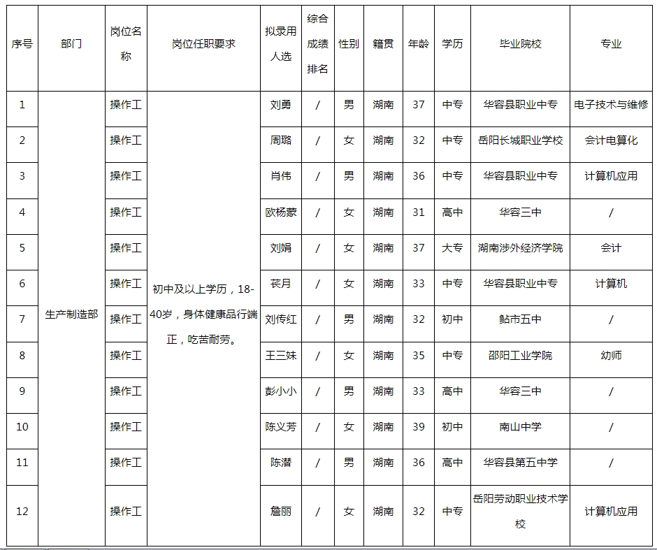 根據(jù)深圳長(zhǎng)虹聚和源科技有限公司發(fā)布的招聘公告及招聘相關(guān)規(guī)定,經(jīng)筆試、面試、考察、體檢等程序,擬錄用以下同志到公司生產(chǎn)制造部工作,現(xiàn)予以公示,具體情況如下: