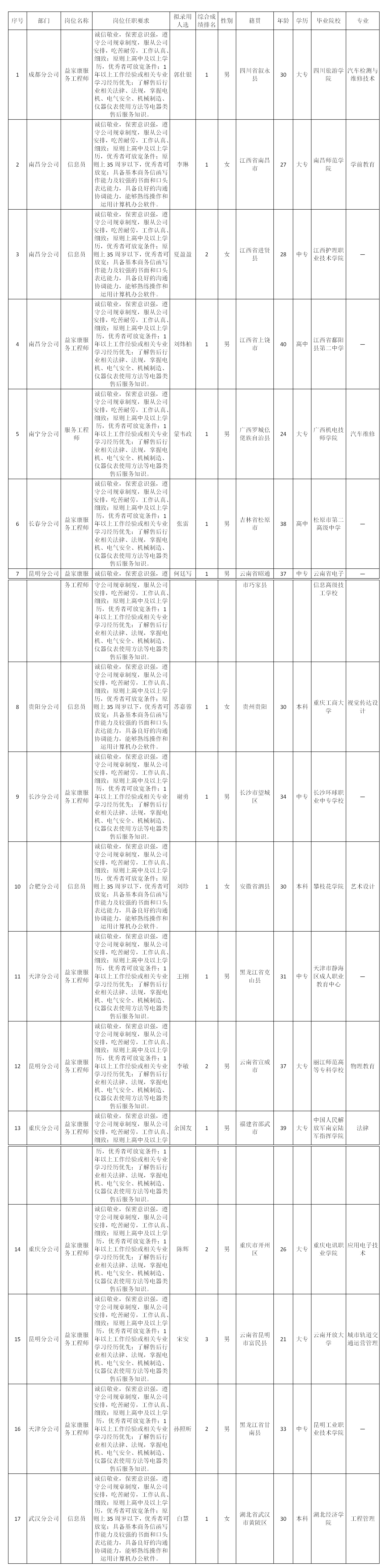 根據(jù)四川快益點電器服務連鎖有限公司發(fā)布的招聘公告及招聘相關(guān)規(guī)定,經(jīng)面試、體檢等程序,擬錄用以下同志到四川快益點電器服務連鎖有限公司工作,現(xiàn)予以公示,具體情況如下: