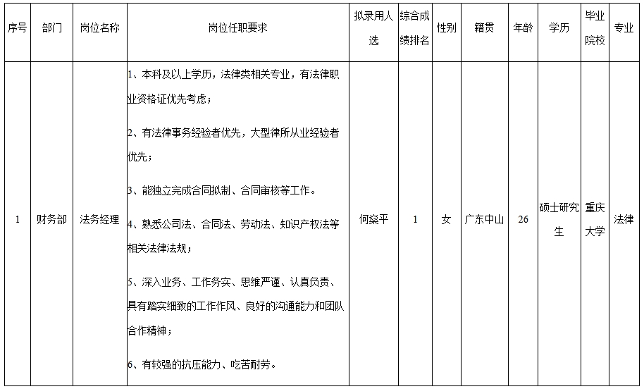 根據(jù)中山長虹電器有限公司發(fā)布的招聘公告及招聘相關(guān)規(guī)定,經(jīng)面試、考察、體檢等程序,擬錄用何燊平同志到法務(wù)經(jīng)理工作,現(xiàn)予以公示,具體情況如下: