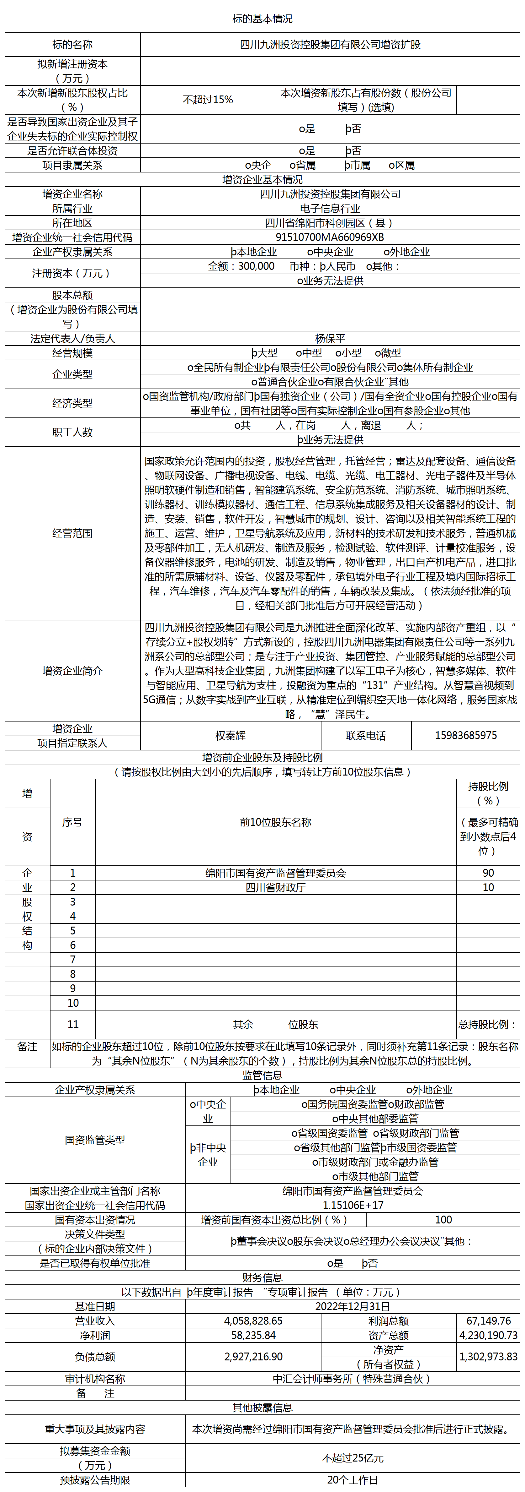 四川九洲投資控股集團(tuán)有限公司增資信息預(yù)披露