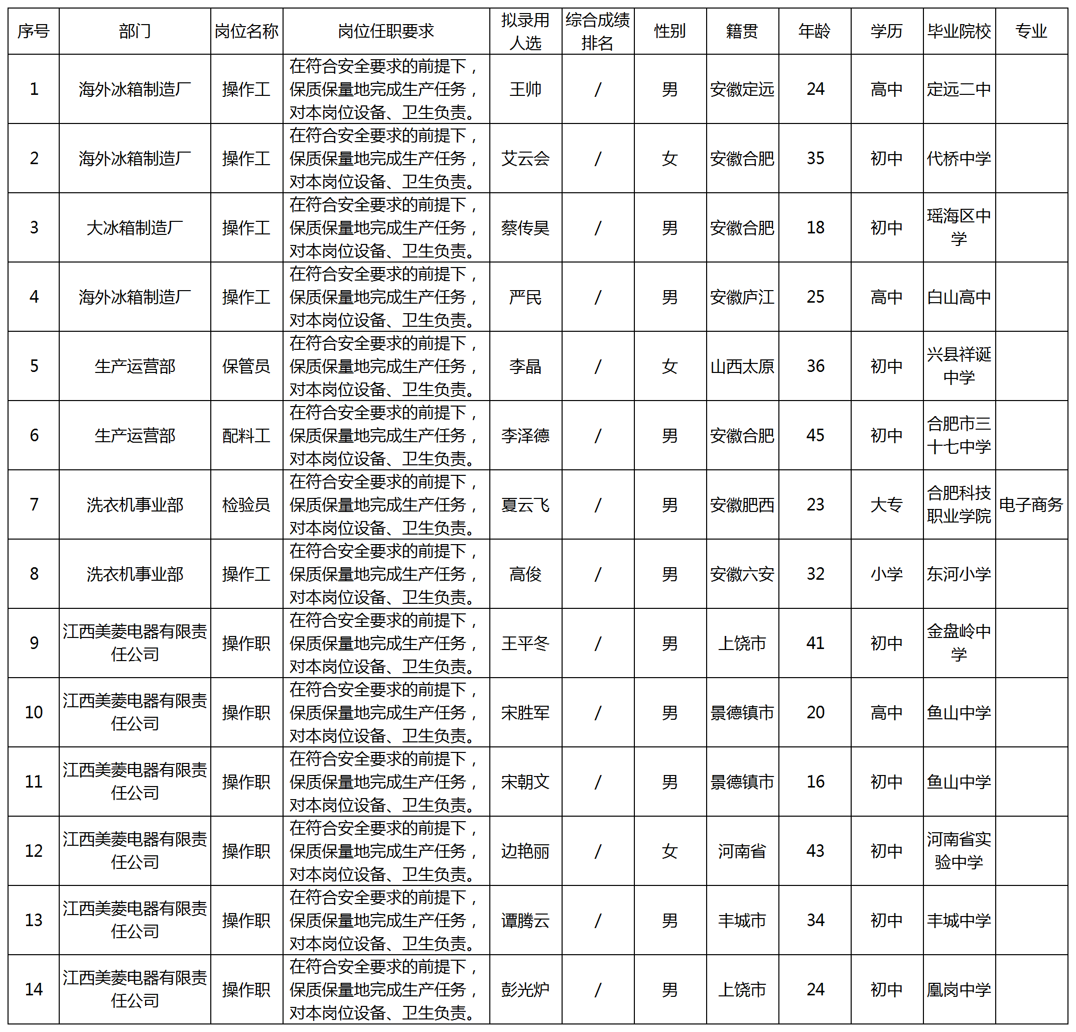 根據(jù)長虹美菱股份有限公司發(fā)布的招聘公告及招聘相關規(guī)定,經面試、體檢等程序,擬錄用王帥等8名同志到大冰箱制造廠等部門工作,現(xiàn)予以公示,具體情況如下: