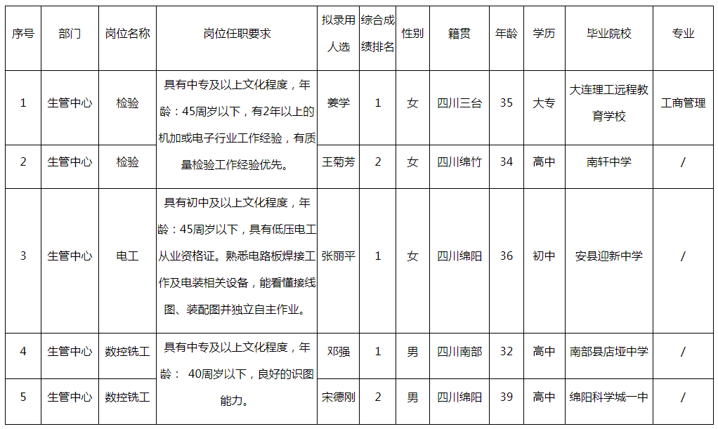 根據(jù)四川長虹智能制造技術(shù)有限公司發(fā)布的招聘公告及招聘相關(guān)規(guī)定,經(jīng)面試、考察、體檢等程序,擬錄用姜學、王菊芳、張麗平、鄧強、宋德剛同志到四川長虹智能制造技術(shù)有限公司工作,現(xiàn)予以公示,具體情況如下: