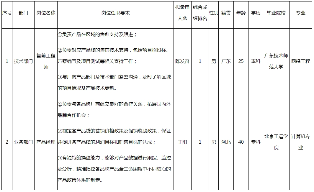 根據(jù)四川長(zhǎng)虹佳華信息產(chǎn)品有限責(zé)任公司發(fā)布的招聘公告及招聘相關(guān)規(guī)定,經(jīng)筆試、面試、考察、體檢等程序,擬錄用陳發(fā)奮、丁陽(yáng)同志到四川長(zhǎng)虹佳華信息產(chǎn)品有限責(zé)任公司工作,現(xiàn)予以公示,具體情況如下: