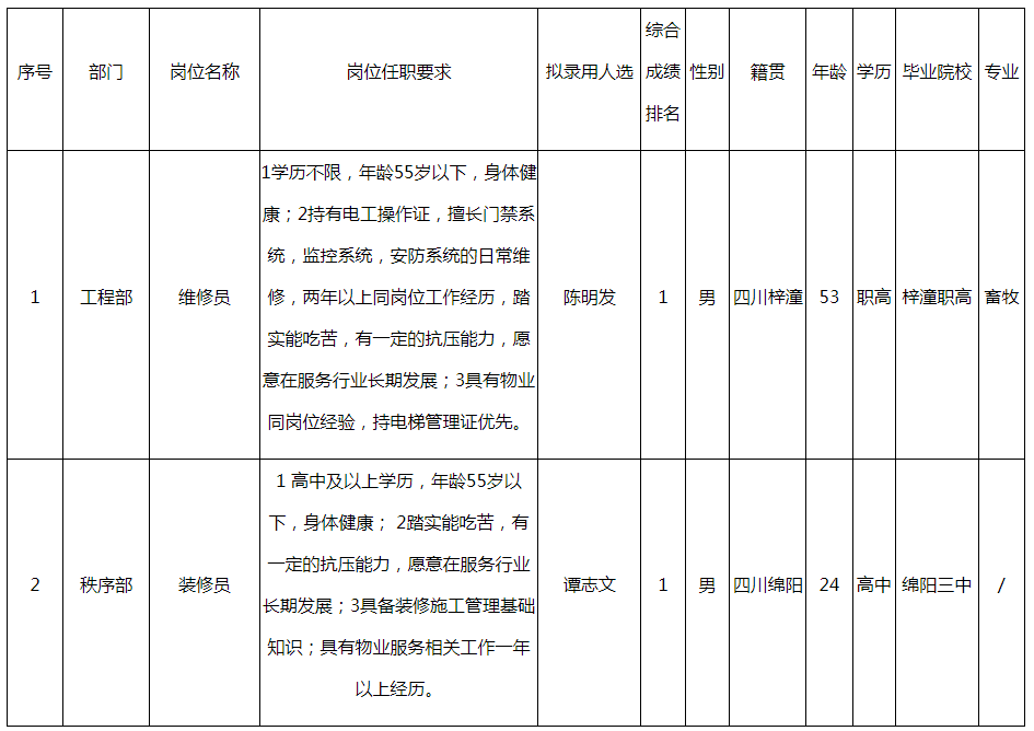 根據(jù)四川長虹物業(yè)服務(wù)有限責(zé)任公司綿陽分公司發(fā)布的招聘公告及招聘相關(guān)規(guī)定,經(jīng)筆試、面試、考察、體檢等程序,擬錄用陳明發(fā)、譚志文同志分別到綿陽天樾、金嶺1號管理處工作?,F(xiàn)予以公示,具體情況如下: