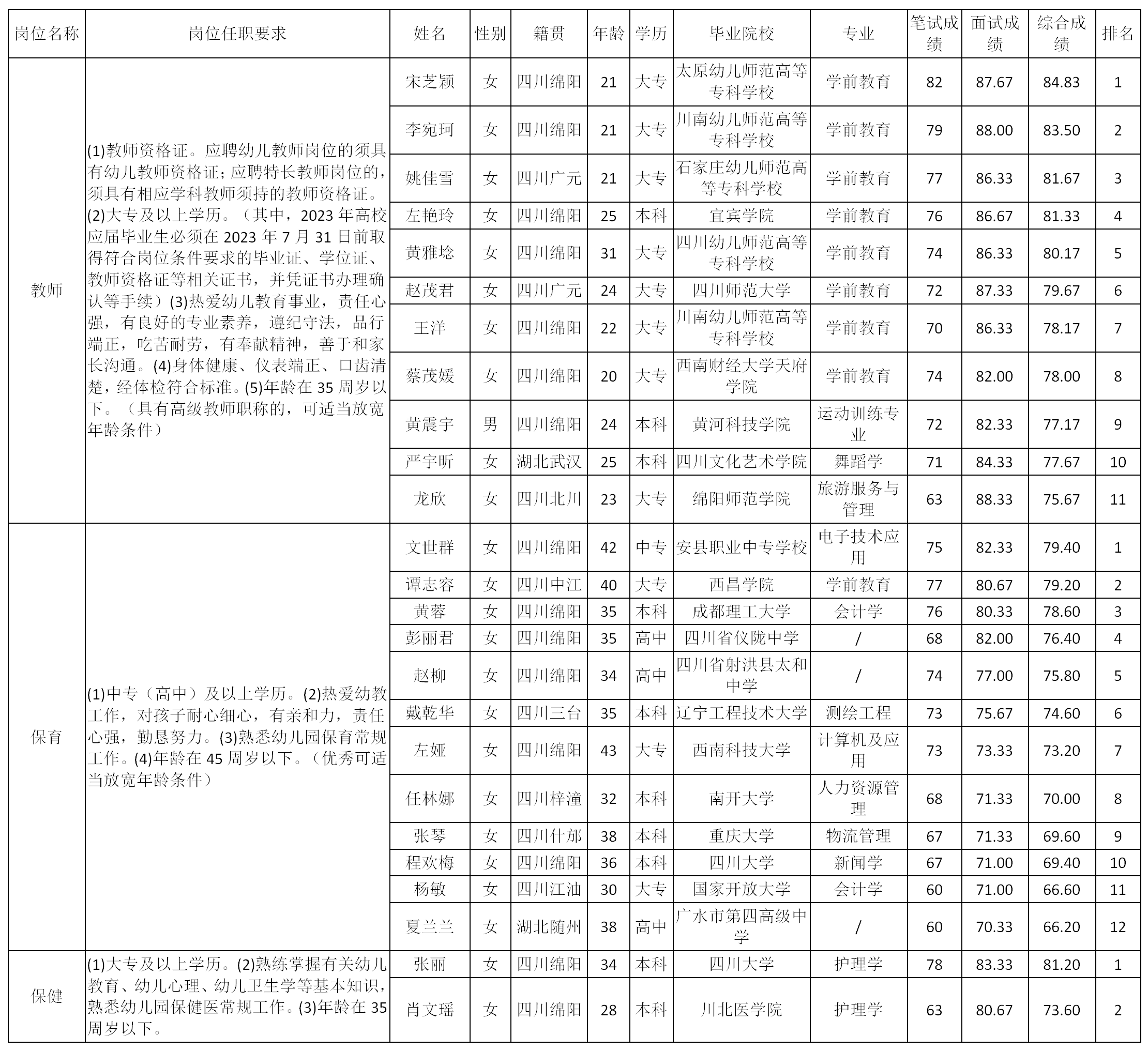 根據(jù)四川川幼春暉學前教育管理有限公司發(fā)布的招聘公告及招聘相關規(guī)定,經(jīng)筆試、面試等程序,現(xiàn)將筆試(面試)成績予以公示。