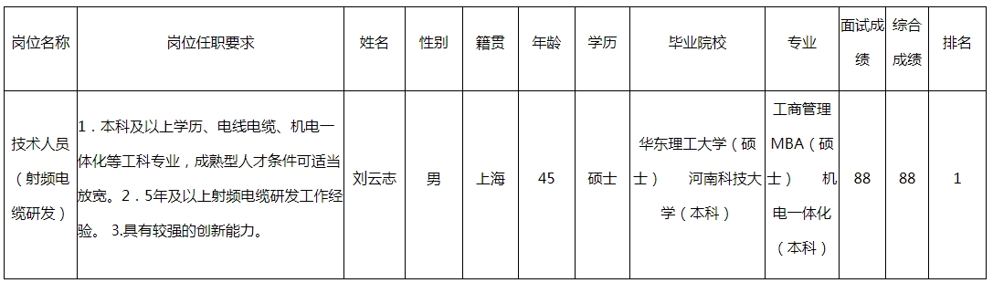 根據(jù)四川九洲線纜有限責(zé)任公司發(fā)布的招聘公告及招聘相關(guān)規(guī)定,經(jīng)面試程序,現(xiàn)將面試成績(jī)予以公示。