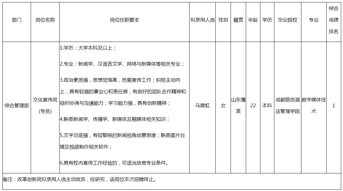 根據(jù)綿陽交通發(fā)展集團(tuán)有限責(zé)任公司發(fā)布招聘公告及招聘相關(guān)規(guī)定,經(jīng)面試、考察、體檢等程序,擬錄用馬茵虹同志到綿陽交通發(fā)展集團(tuán)有限責(zé)任公司工作,現(xiàn)予以公示,具體情況如下: