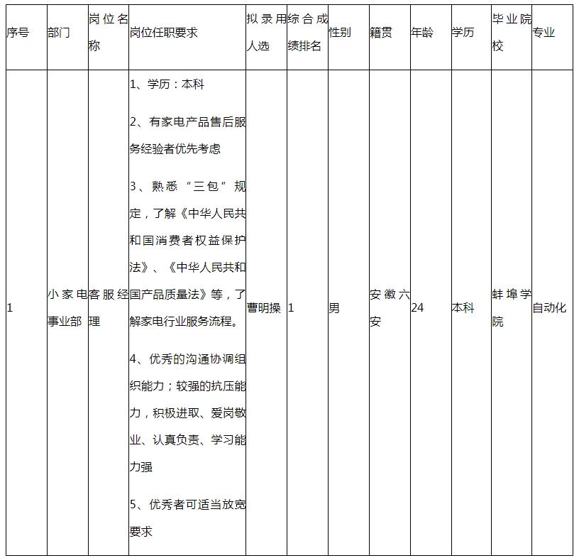 根據(jù)公司經(jīng)營管理需要,小家電事業(yè)部招聘客服經(jīng)理崗位1人,經(jīng)簡歷篩選、面試、體檢等程序,曹明操滿足錄用條件,現(xiàn)予以公示。