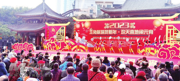 歌舞鬧春,元宵情濃。2月4日,正月十四,綿陽(yáng)市2023年元宵節(jié)惠民演出暨綿樂(lè)薈主題文藝匯演在鐵牛廣場(chǎng)舉行。群眾文藝演出、非遺展示、圖書閱讀服務(wù)等活動(dòng),讓市民“一站式”享受到節(jié)日的歡樂(lè)和公共文化的福利。