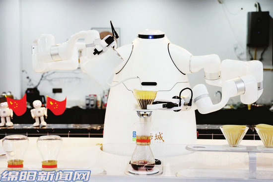 2月5日,綿陽(yáng)市涪城區(qū)創(chuàng)青年·1952項(xiàng)目生產(chǎn)的機(jī)器人,磨出新年的第一杯咖啡。(綿報(bào)融媒記者 陳冬冬 攝)