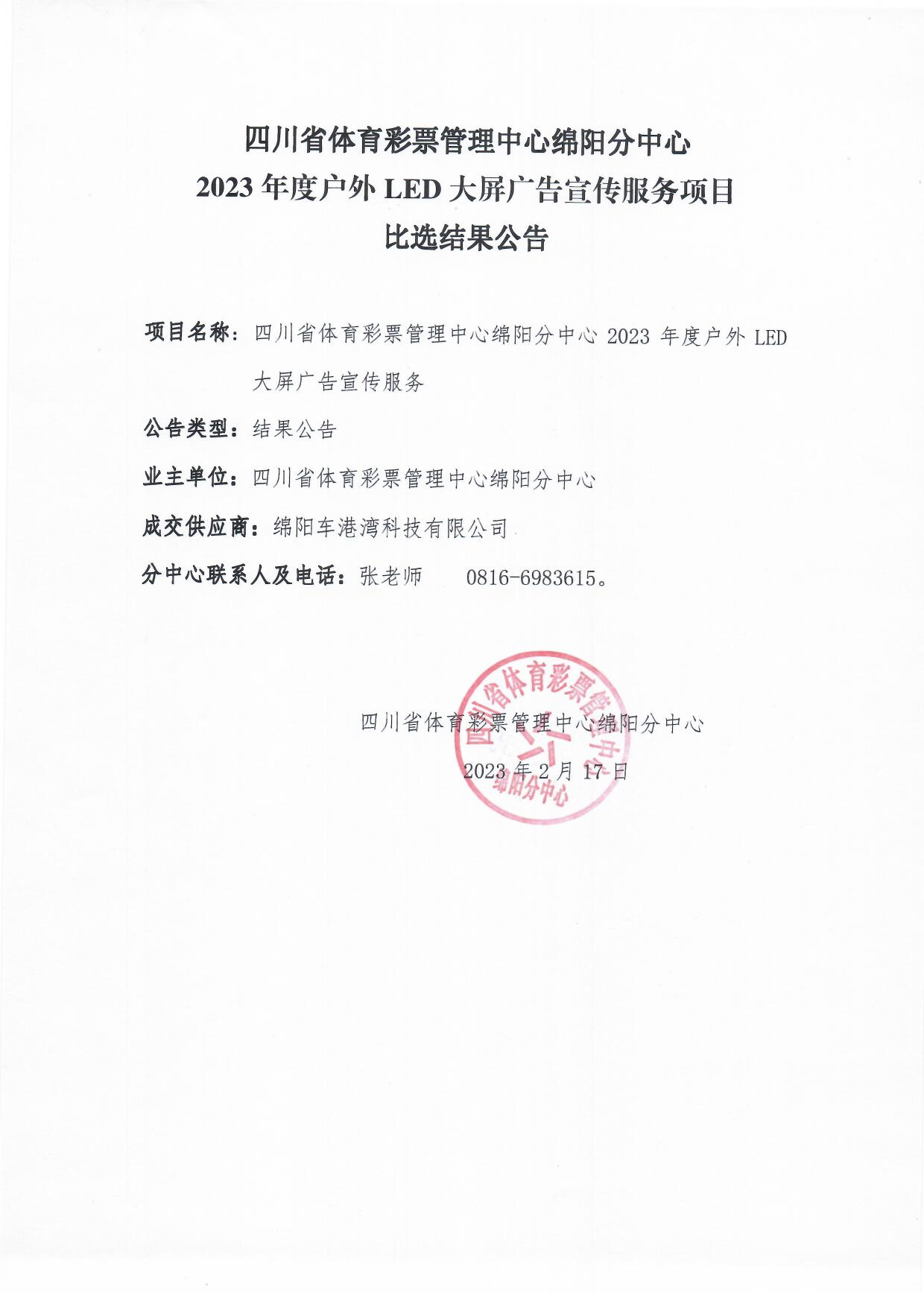 四川省體育彩票管理中心綿陽分中心2023年度戶外LED大屏廣告宣傳服務(wù)項目比選結(jié)果公告