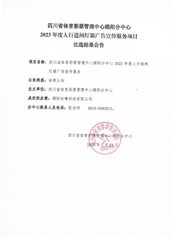 四川省體育彩票管理中心綿陽分中心2023年度人行道閘燈箱廣告宣傳服務項目比選結(jié)果公告