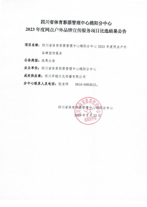 四川省體育彩票管理中心綿陽分中心2023年度網(wǎng)點(diǎn)戶外品牌宣傳服務(wù)項目比選結(jié)果公告