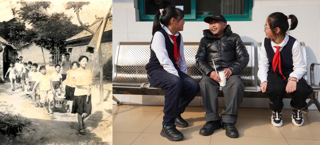 左圖:20世紀(jì)60年代,金沙小學(xué)五(2)雷鋒中隊(duì)隊(duì)員幫助軍烈屬打水(新華社發(fā));右圖:2023年2月24日,金沙小學(xué)學(xué)生們和當(dāng)?shù)鼐蠢显豪先肆奶?新華社記者 季春鵬 攝)(拼版照片)。