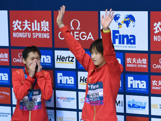 2022年10月22日,冠軍陳芋汐(右)和亞軍全紅嬋在2022年跳水世界杯女子10米跳臺決賽后。新華社記者任鵬飛攝