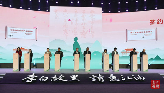 開幕式前,曹立軍、胡云、吉狄馬加、李云等與會領導參觀了綿陽市文旅資源和項目展、涪江流域精品非遺主題展。開幕式上,發(fā)布了李白重要游蹤地文化旅游聯(lián)盟2023宣言、音樂劇主題曲《將進酒》、數(shù)字人“李白”、招商項目清單,舉行了重點文旅項目簽約儀式。