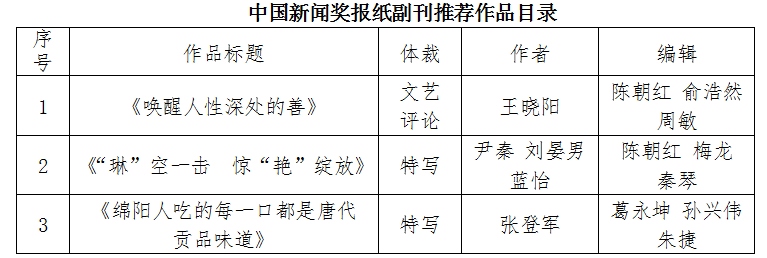 根據《中國新聞獎評選辦法》規(guī)定的程序,經民主推薦及評委會評議,綿陽日報社擬推薦以下3件作品參加報紙副刊作品的初評,現予以公示。公示期為3月27日至31日。如有異議,可通過書面、電話方式,于3月31日17時前進行反映。