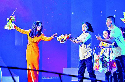 3月26日,演員姚晨(左一)和福建師范大學(xué)學(xué)生在表演《偶戲情牽》。新華社記者 林善傳攝