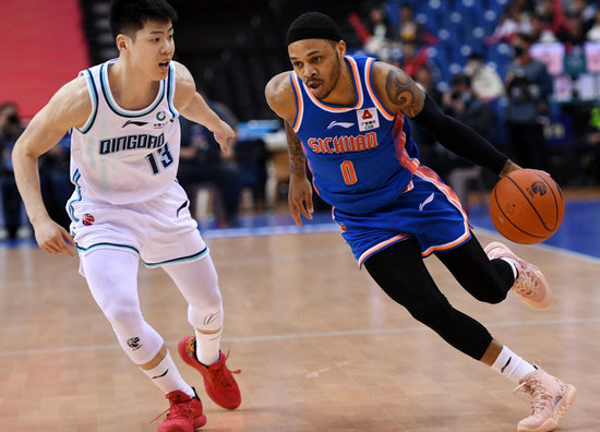 4月2日,青島隊球員劉家昕(左)在比賽中防守四川隊球員馬蘭。新華社記者李紫恒攝