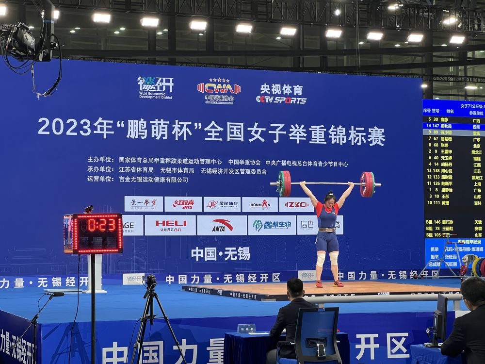 抓舉比賽蘇小瓊?cè)卧嚺e全部成功,成績定格在111公斤,但最后一個登場的四川隊楊秋霞開把就舉起113公斤,隨后又完成116公斤,鎖定抓舉金牌。蘇小瓊和廣西隊唐靜分獲抓舉比賽第二、三名。
