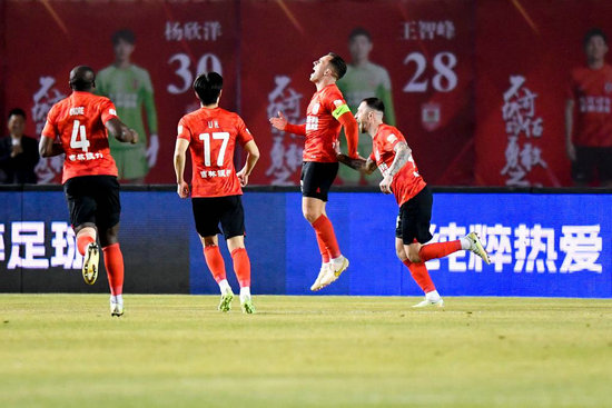 4月22日,長春亞泰隊球員塞爾吉尼奧(右二)在比賽中慶祝進球。新華社記者 許暢 攝