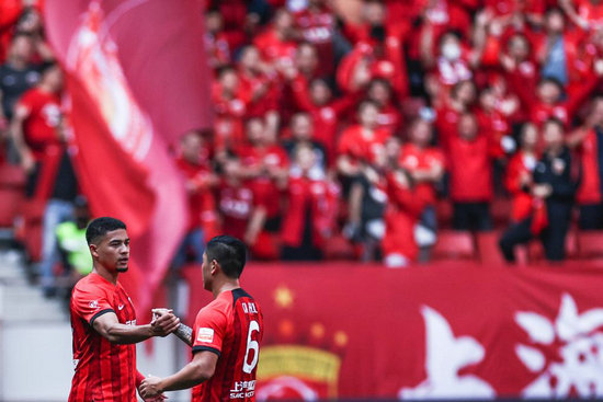 4月22日,上海海港隊球員蔣光太(左)與隊友蔡慧康在比賽中慶祝。新華社發(fā)