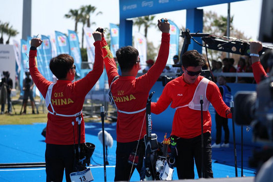 李中原、齊翔碩和魏紹軒組成的中國男隊當日贏得極為驚險。首局中國隊以55:54微弱優(yōu)勢拿下,第二局中國隊以56:50輕松再下一城,大比分4:0領(lǐng)先。第三局兩隊都發(fā)揮出了高水平,印度隊六箭有五箭射中10環(huán),以59:58扳回一城。第四局中國隊在最后一箭命中9環(huán)即可奪冠的情況下,射中一個8環(huán),印度隊56:55再勝,將總比分扳成4:4。附加賽中兩隊均得到28環(huán)的成績,且均為兩個9環(huán)、一個10環(huán),憑借李中原射中的X(10環(huán)內(nèi)圈),中國隊5:4險勝對手奪冠。