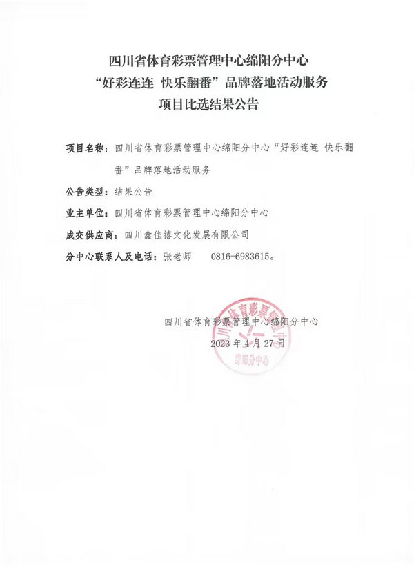 四川省體育彩票管理中心綿陽分中心“好彩連連 快樂翻番”品牌落地活動服務(wù)項目比選結(jié)果公告