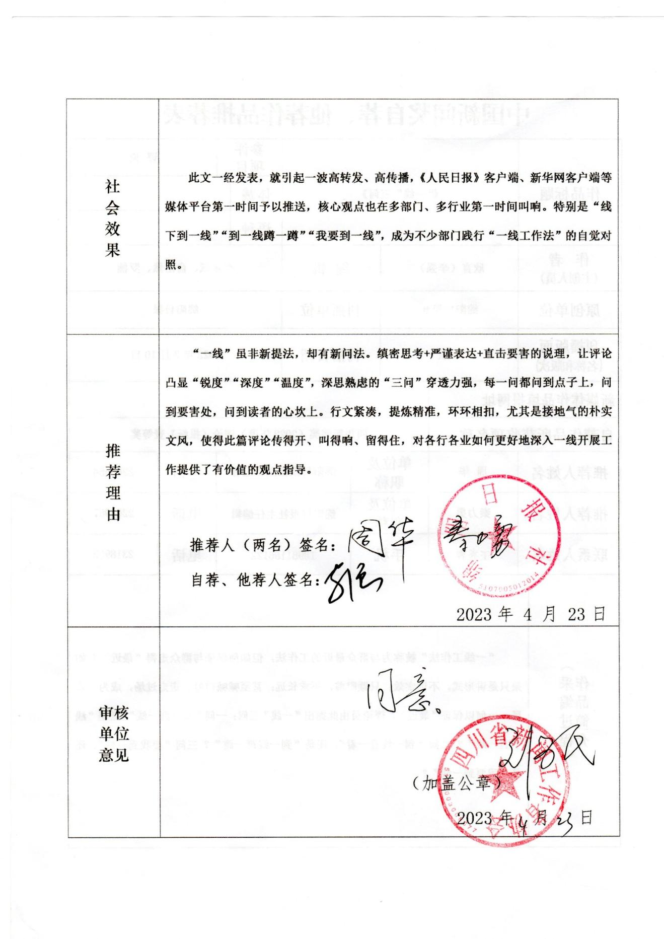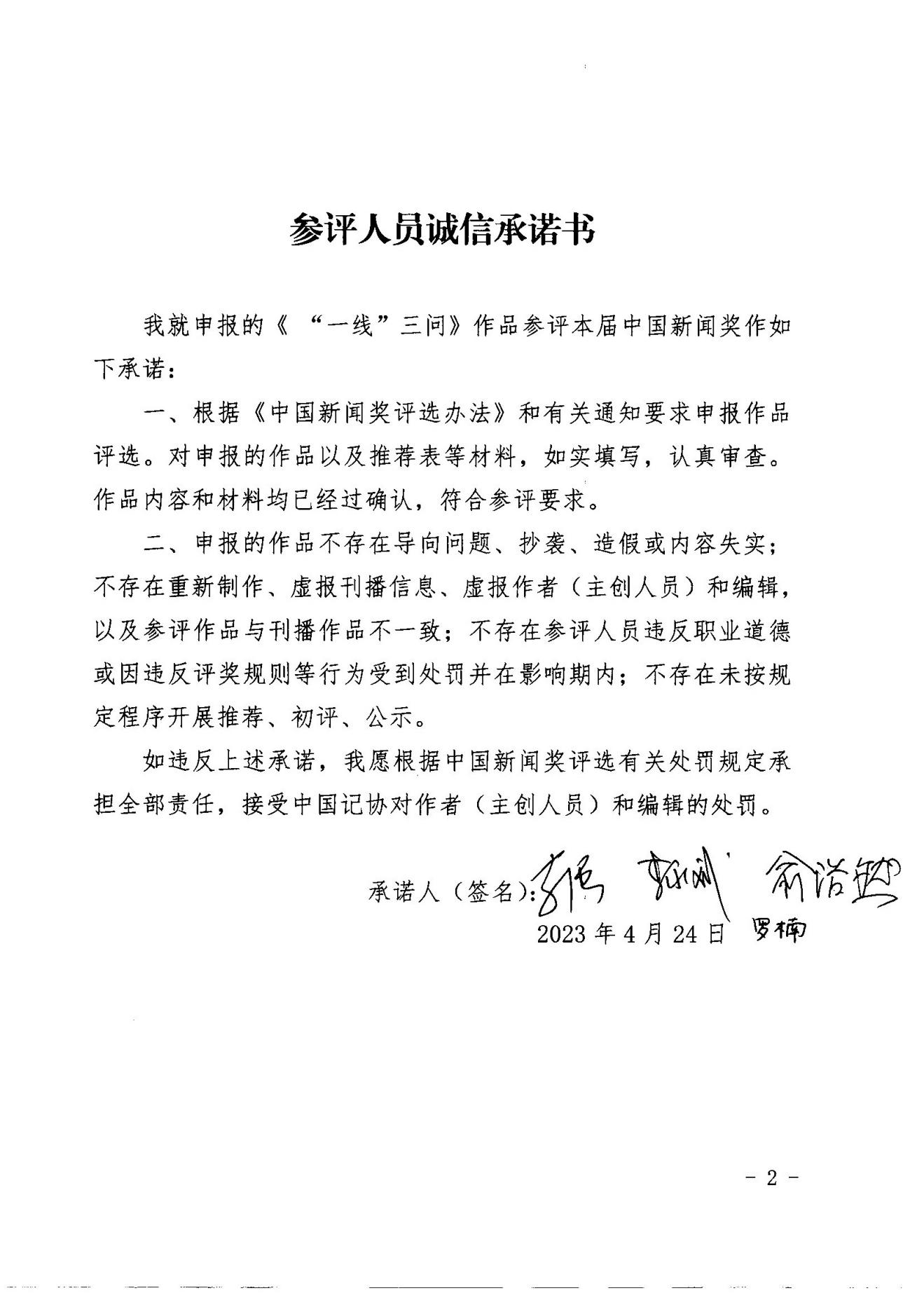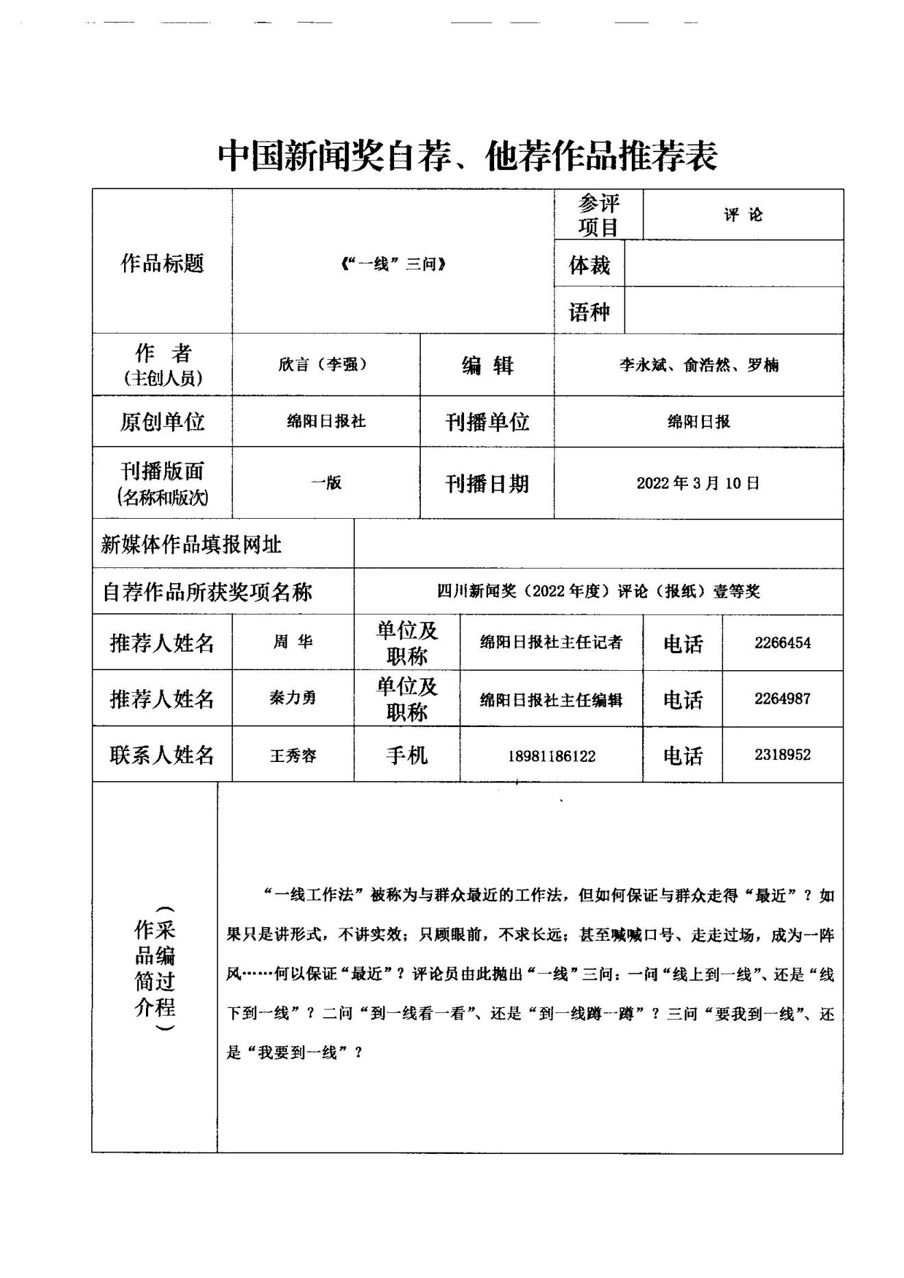 根據(jù)《中國(guó)新聞獎(jiǎng)評(píng)選辦法》和《第33屆中國(guó)新聞獎(jiǎng)參評(píng)作品報(bào)送通知》,由綿陽(yáng)日?qǐng)?bào)社記者李強(qiáng)撰寫,李永斌、俞浩然、羅楠編輯的評(píng)論作品《“一線”三問(wèn)》擬自薦參評(píng)第33屆中國(guó)新聞獎(jiǎng)。現(xiàn)將作品相關(guān)信息進(jìn)行公示,公示期為5天。在此期間,如有異議,可通過(guò)電話、郵件等方式反映。